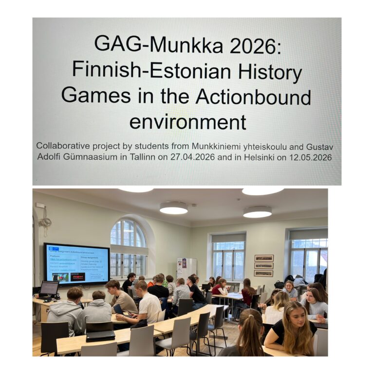 Aga see ei ole veel kõik! Meie G1Ü klassi ja sõpruskooli õpilased alustasid Tallinnas koostööd Eesti ja Soome ajaloo teemaliste mängude loomise projektiga “GAG-Munkka 2026: Finnish-Estonian History Games in the Actionbound environment”. Mängud valmivad lõplikult õpilaste koostöös Helsingis 12. mail 2026.